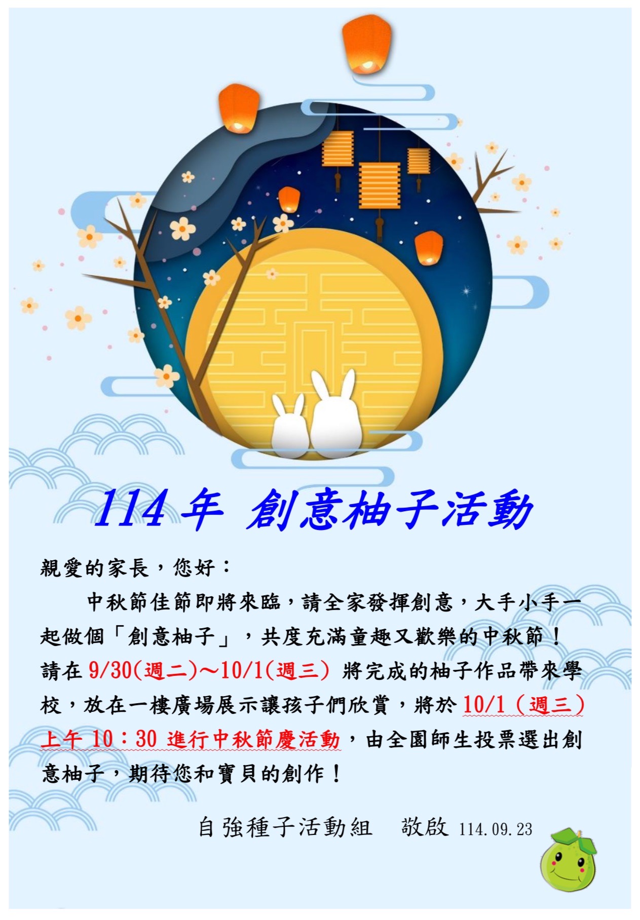 將於10/1(週三)上午10:30進行中秋節慶活動,由全園師生投票選出創意柚子,期待您和寶貝的創作!