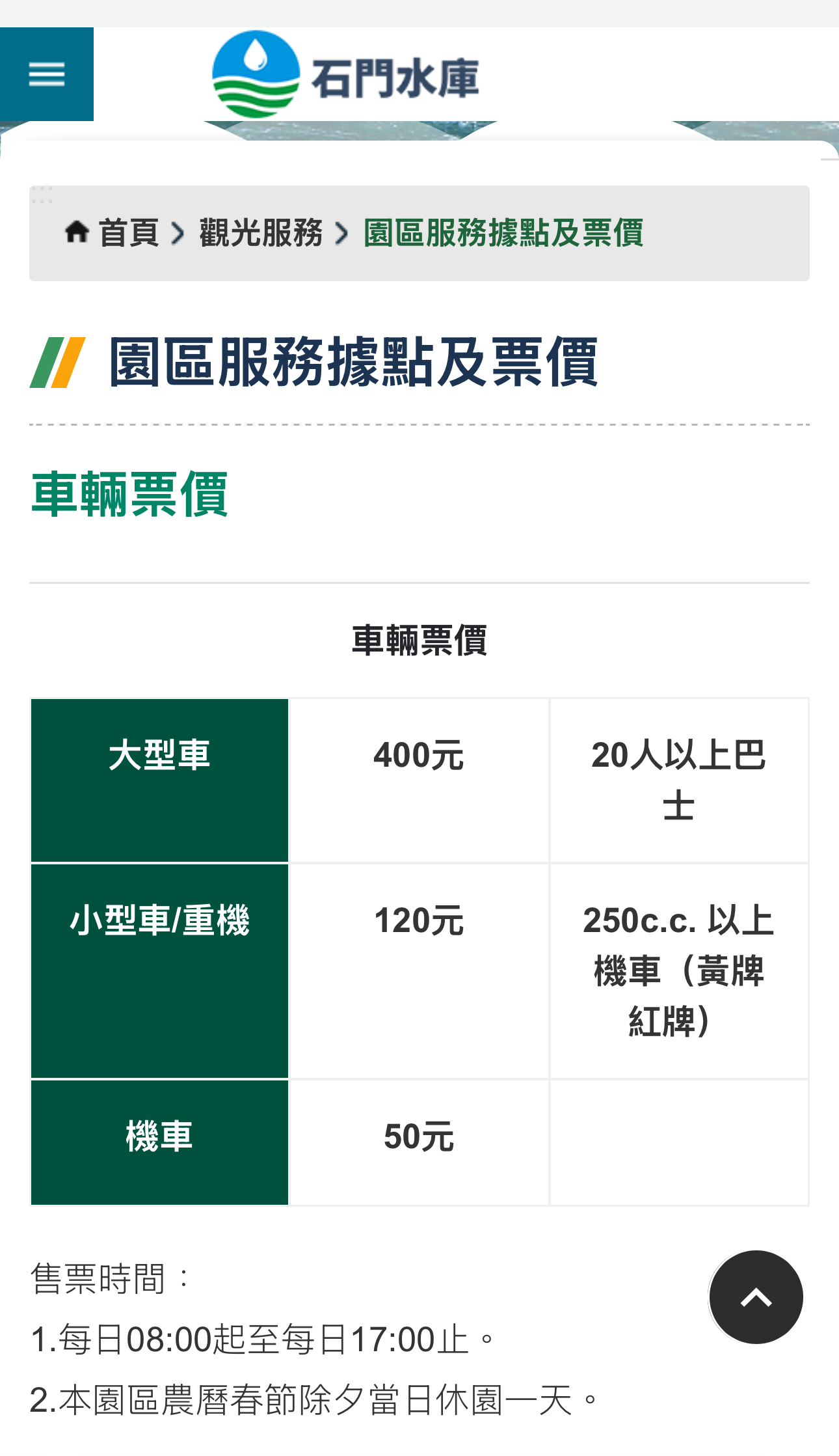 2、【石門水庫園區車輛票價規定】: